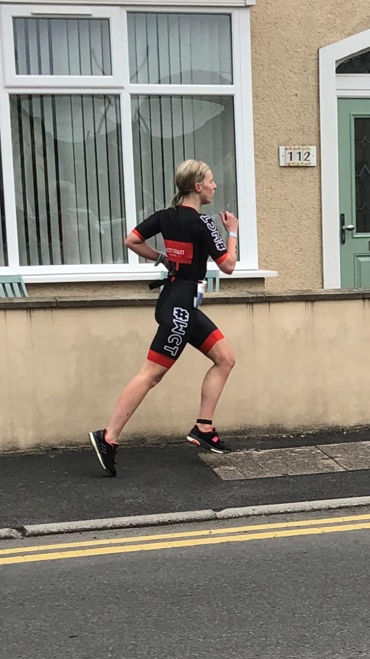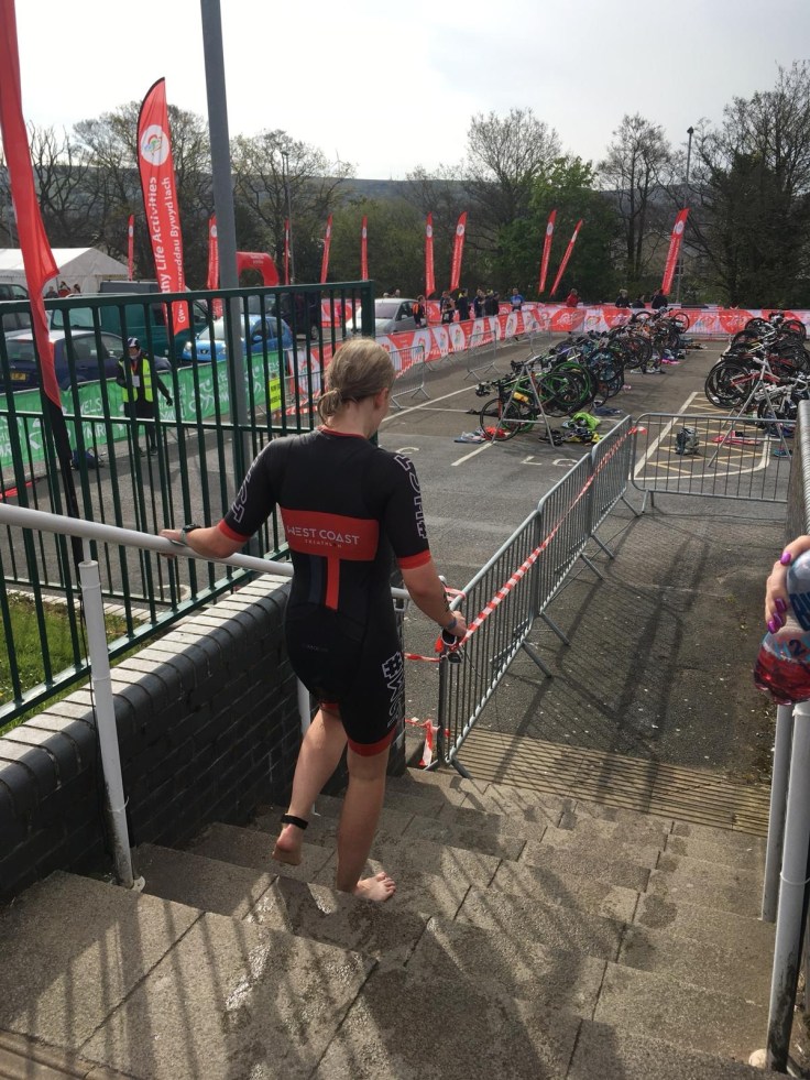 Running through transition and my recurring hamstring injury reared its head. Gutted, I was concerned, the run hadn’t even started yet! I got back to my spot and three Welsh Triathlon officials were standing in my way chatting!! A firm “excuse me” and I racked my bike. As I changed shoes Claire, who was one of the marshals, leant over and pointed me in the direction of run exit. She had correctly predicted that I was about to try and run out of the bike exit! Thanks Claire!
