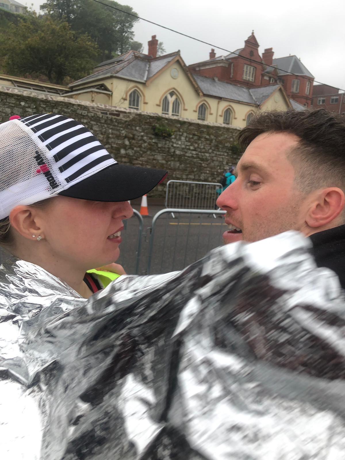 Next thing, who did I spot – David was behind the barrier shouting encouragement. “Des ti nôl!” (you came back!) I exclaimed as I hugged him and cried. “Go on you have to run” he said and I ran (shuffled) down the remainder of the red carpet waving my foil blanket behind me in a size large yellow raincoat that was almost down to my knees! Looking good for the camera was the last thing on my mind.