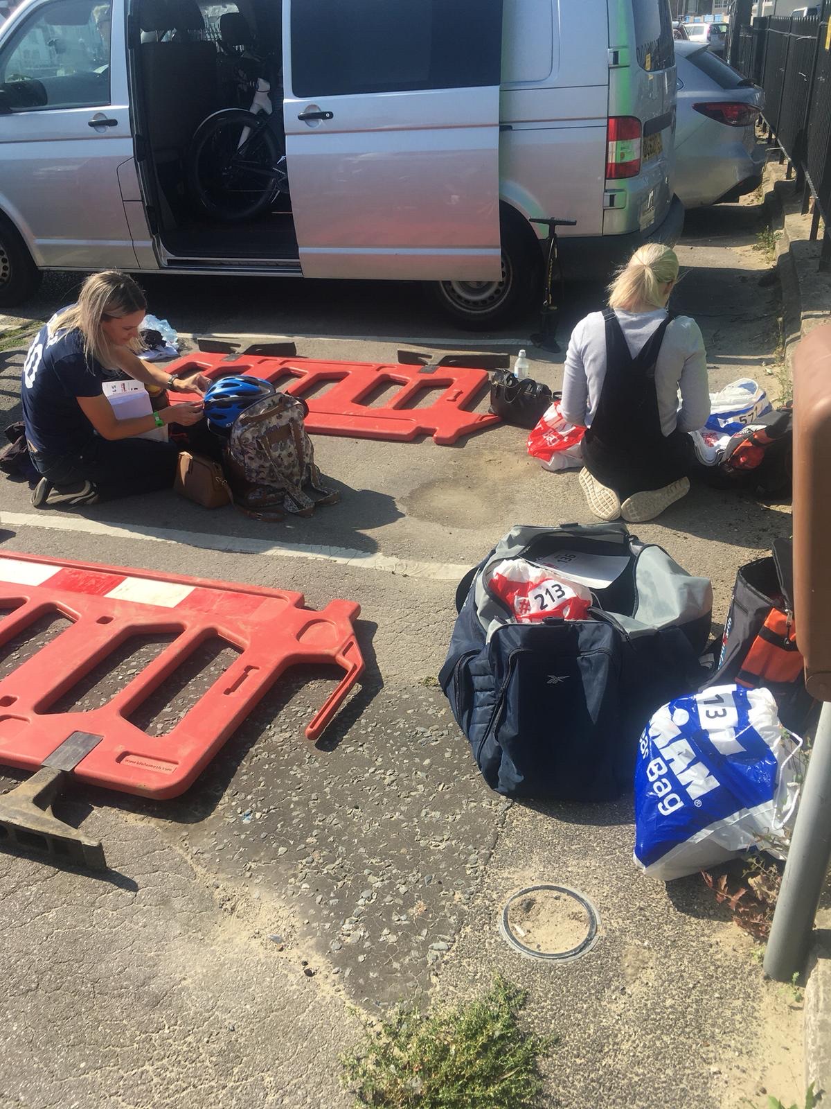 We arrived at a sunny but windy Weymouth and managed to get a parking spot at the Pavilion where we registered before sitting on the carpark floor to put our stickers on the kit and sort our kit into the transition bags.