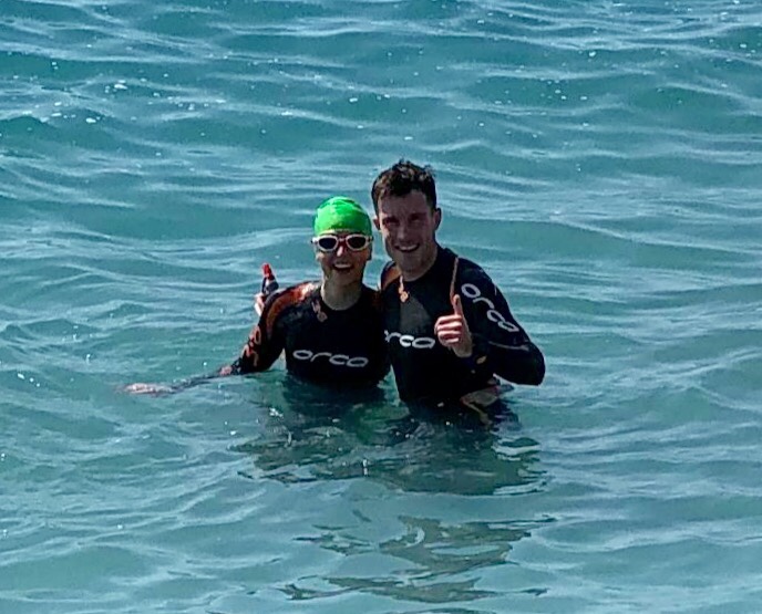We also headed to the beach and I was stood in the sea, as near the swim exit as possible but somehow I still missed him coming out of the water! My tracker pinged and I sprinted up to transition. He ran towards me similing and giving me a thumbs up which I was pleased to see considering his swim had been slightly down on what it had been in Mallorca. This was due to two things – the sea conditions – we knew from swimming in the week that due to the currents it would be slightly slow. The fact that it was non-wetsuit slowed him down even further. David definitely benefits from the extra buoyancy.