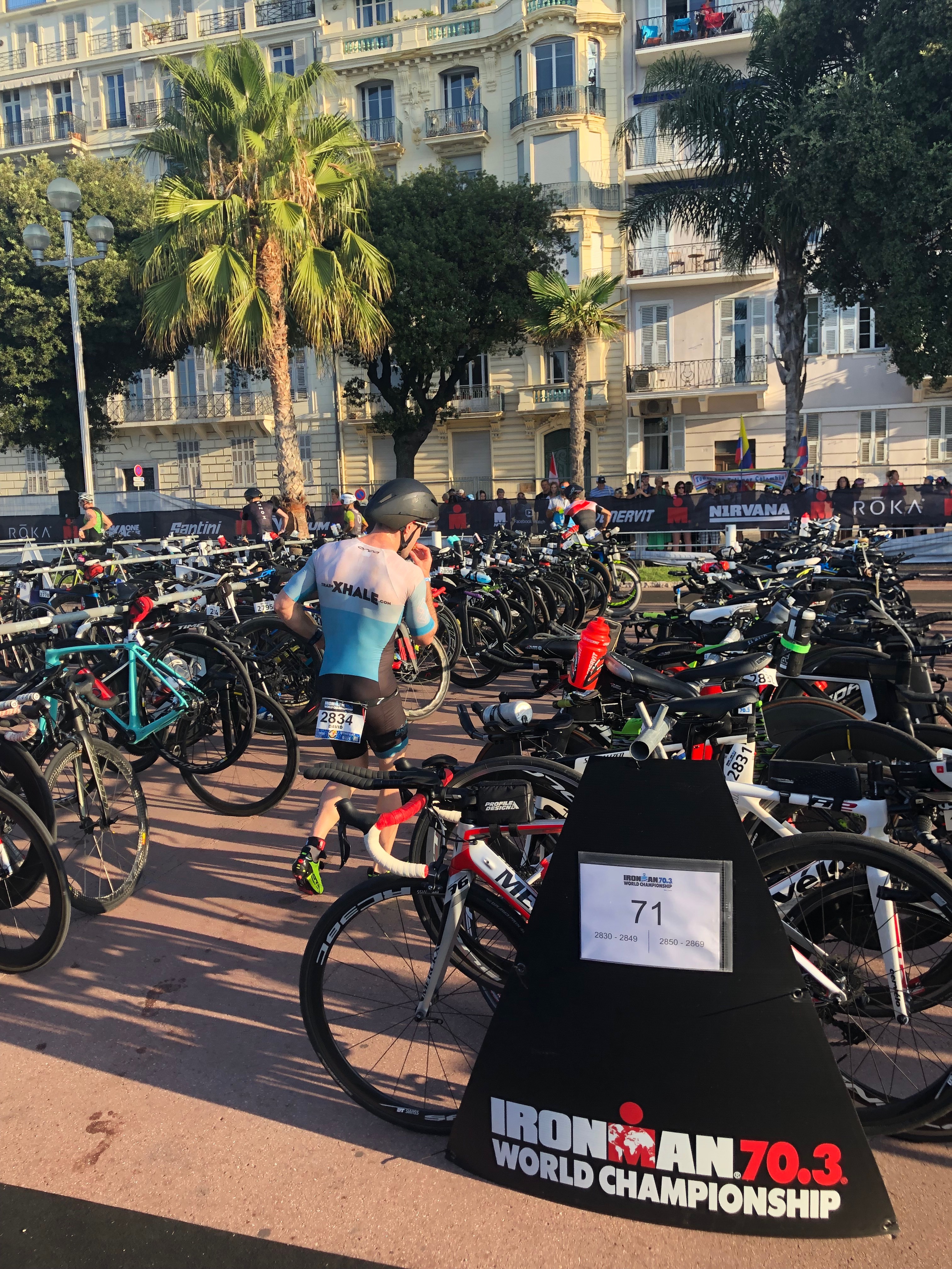 Saturday was the women’s race day. Despite the road closures driving to Nice was easy enough – thanks to Google Maps which knew which roads were closed and was able to navigate us into Nice without issue. We arrived to see the last of the age groups swim and watched the drama of the pro race unfold (Lucy Charles’ penalty!) on the big screen they had on the finish line. Watching the pro’s come in on the bike and then running was an amazing experience and it was especially cool to see them strolling around the race venue afterwards too. It’s not many races where you get so many top professional athletes in one place.